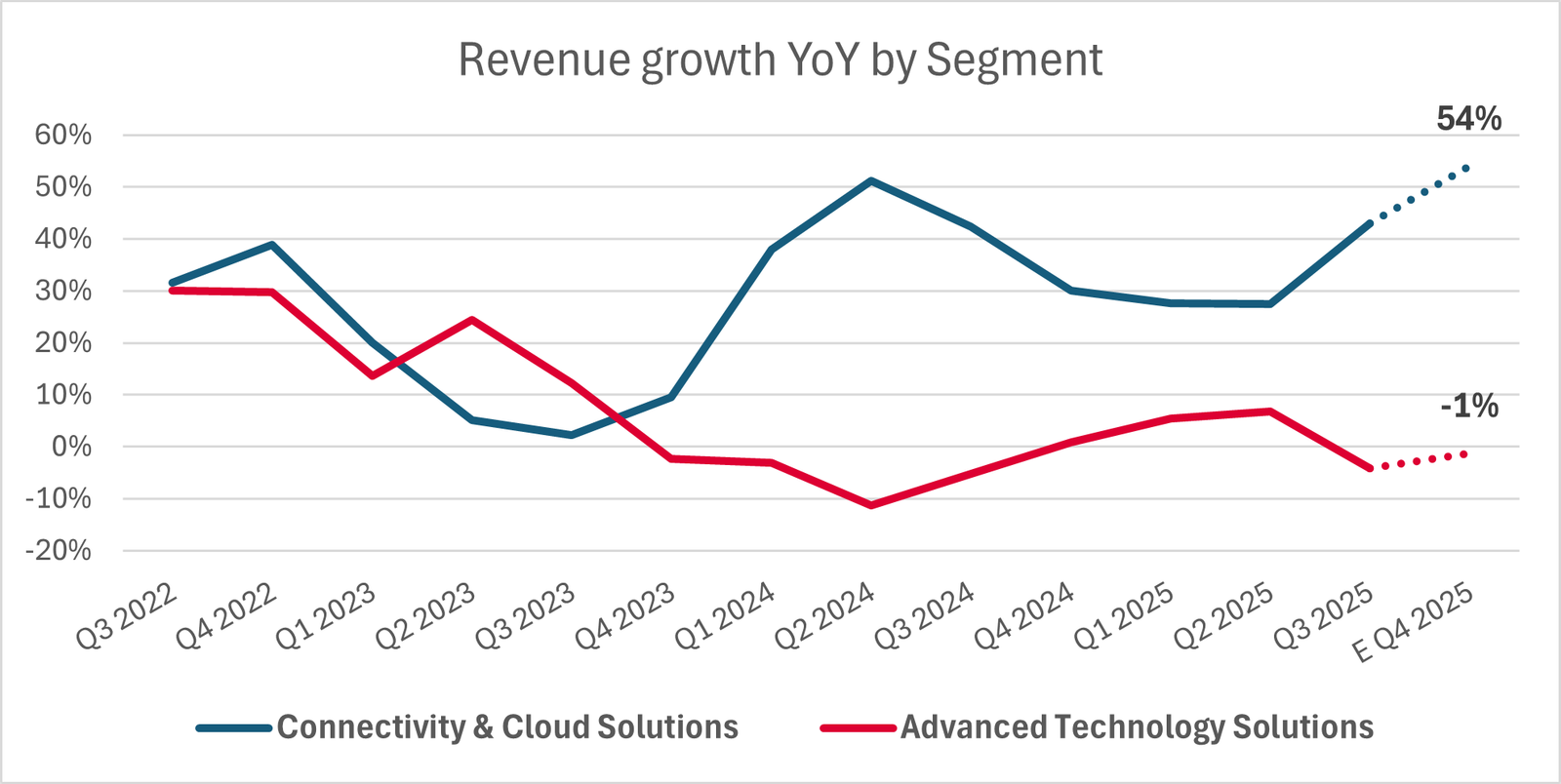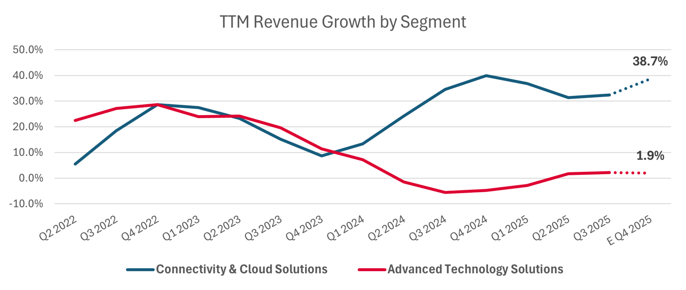 La tesi di investimento per Celestica si basa sulla convinzione che il mercato stia sottovalutando una riaccelerazione strutturale nel segmento Connectivity & Cloud Solutions, che oggi rappresenta circa il 75-80% dei ricavi del gruppo ed è direttamente esposto ai data center guidati dall’IA e alle infrastrutture di networking ad altissima velocità. Dopo la forte crescita registrata nel 2024, le aspettative del consensus implicano ora una decelerazione, mentre il commento del management e le dinamiche sottostanti del settore indicano invece una crescita sostenuta, e potenzialmente in accelerazione, per tutto il 2026 e nel 2027.