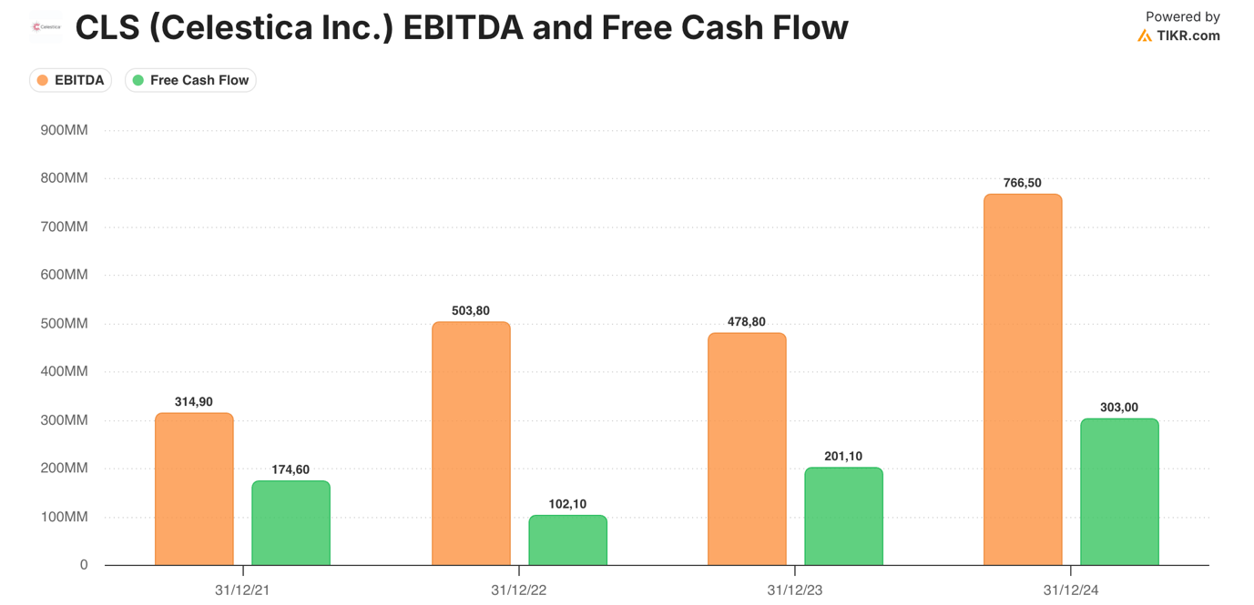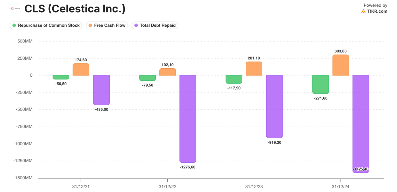 Cosa importante, questa solidità di bilancio è sostenuta da una costante generazione di free cash flow. Nel periodo 2021–2024, Celestica ha generato un free cash flow cumulativo di circa 780 milioni di dollari canadesi, con un FCF annuale passato da 175 milioni nel 2021 a 303 milioni nel 2024.
