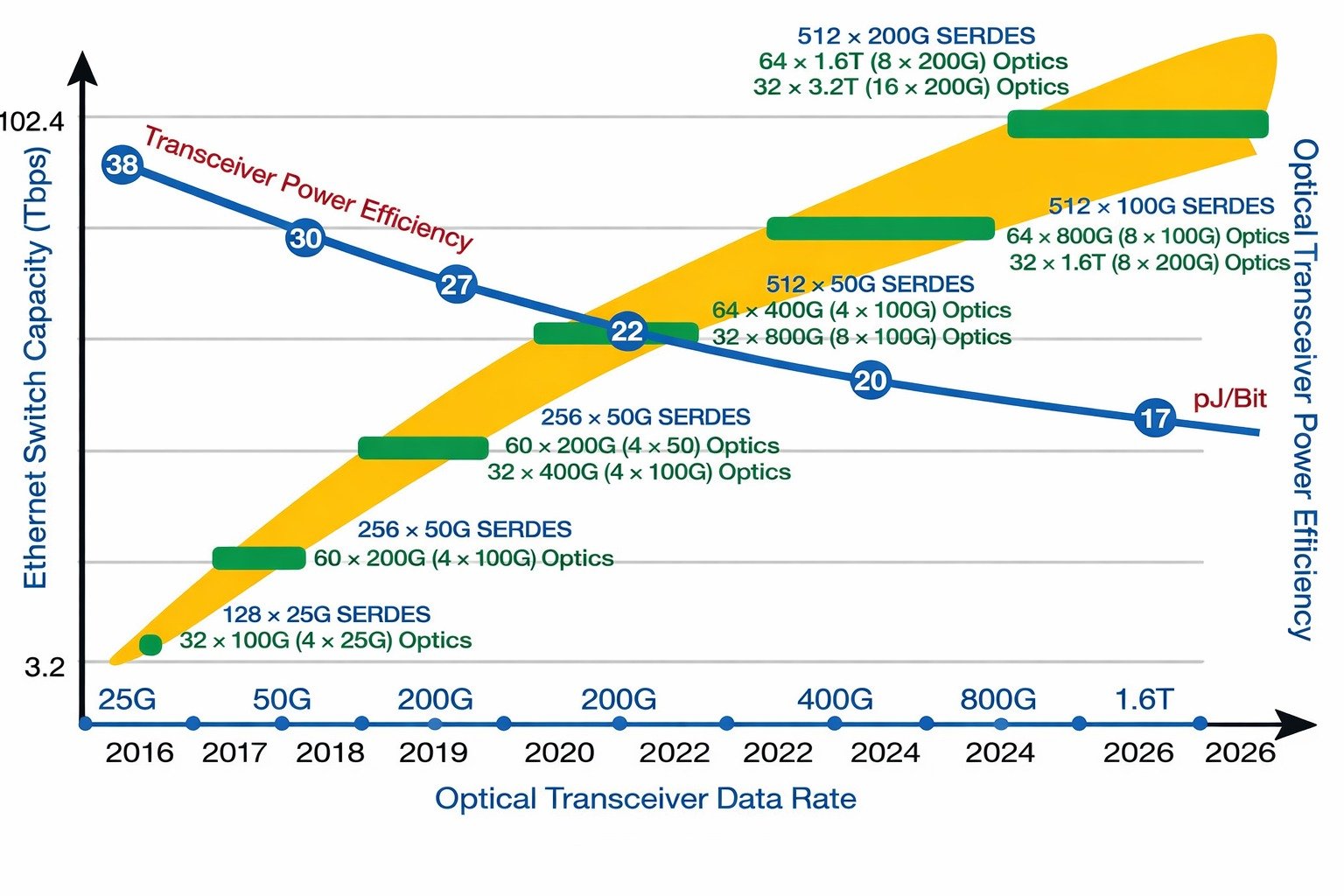 Il grafico illustra come l’evoluzione dall’Ethernet 100G al 400G, all’800G e infine al 1.6T non sia un semplice aumento di velocità, ma una trasformazione strutturale dell’architettura di rete dei data center. Con l’aumento dei data rate dei ricetrasmettitori ottici, la capacità complessiva degli switch scala in modo esponenziale, spinta dalla necessità di interconnettere cluster di calcolo IA sempre più densi.