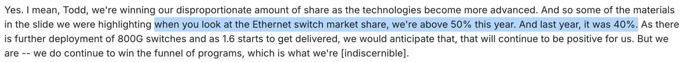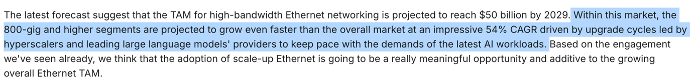 Cosa importante, il commento del management suggerisce che l’adozione di architetture Ethernet scale-up rappresenti un’opportunità incrementale significativa piuttosto che uno spostamento a somma zero all’interno del mercato Ethernet esistente, espandendo di fatto il TAM anziché limitarsi a ridistribuire la spesa.