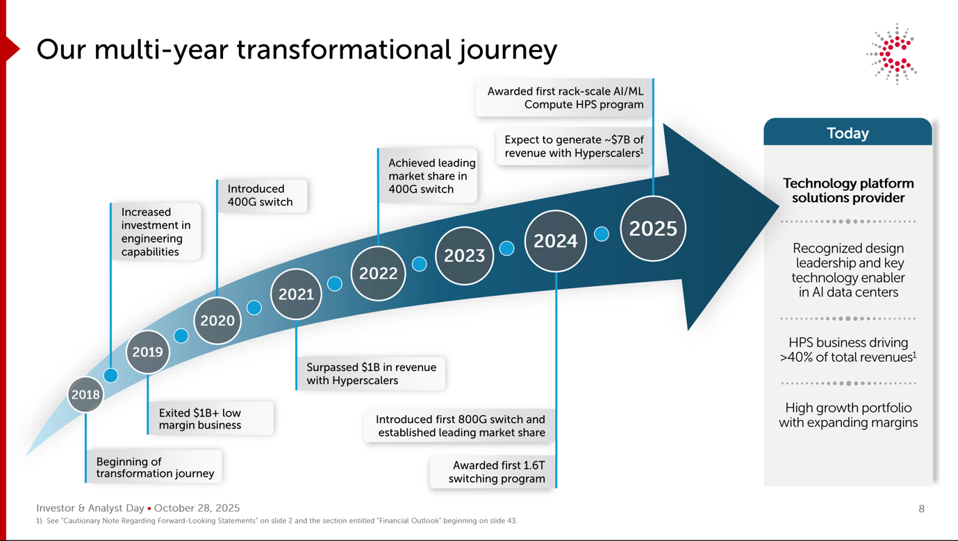 A livello di segmento, i margini CCS si sono ampliati all’8,3%, riflettendo sia un mix di programmi favorevole che una migliore esecuzione. Un motore fondamentale è stato il business delle Hardware Platform Solutions (HPS), che ha generato ricavi per 1,4 miliardi di dollari (in crescita del 79% su base annua), arrivando a rappresentare il 44% dei ricavi totali della società. Il management ha attribuito questa impennata all’accelerazione dei volumi nei programmi di switch 800G in fase di avvio per i principali hyperscaler.