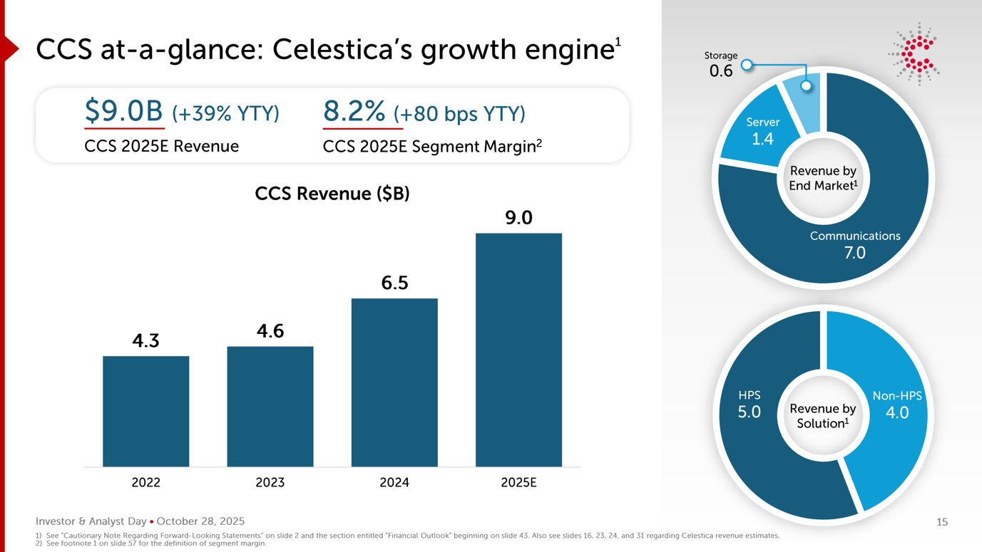 Il segmento CCS rappresenta sia il principale motore di crescita che l’ancora strategica dell’attuale posizionamento di Celestica. Questo focus strategico è già evidente nelle recenti performance. I ricavi del segmento CCS sono aumentati di circa il 40% su base annua nel 2024, raggiungendo i 6,5 miliardi di dollari, trainati dalla forte domanda degli hyperscaler nei mercati finali Enterprise e Communications. Guardando al futuro, il management prevede che i ricavi CCS cresceranno ulteriormente fino a circa 9,0 miliardi di dollari nel 2025E, sottolineando sia lo slancio della spesa infrastrutturale guidata dall’IA, sia la crescente dipendenza dell’azienda da questo segmento come principale driver di crescita.
