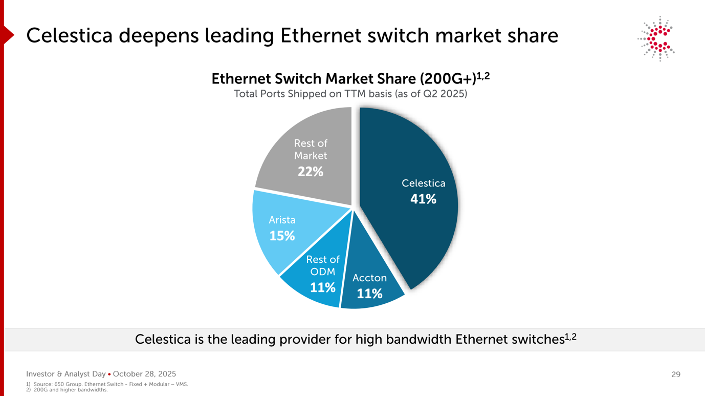 Mentre l’azienda ha riportato una quota di mercato del 41% negli switch Ethernet superiori a 200G su base trailing twelve-month (TTM) al secondo trimestre dell’anno fiscale 2025, il management ha osservato durante la call del terzo trimestre 2025 che Celestica è sulla buona strada per superare una quota di mercato del 50% su base run-rate per l’anno in corso, rispetto al 40% circa dello scorso anno. Questa divergenza riflette l’accelerazione dell’implementazione delle piattaforme 800G e l’aggiudicazione dei primi programmi nel segmento 1.6T, che non sono ancora pienamente riflessi nei dati TTM retrospettivi.
