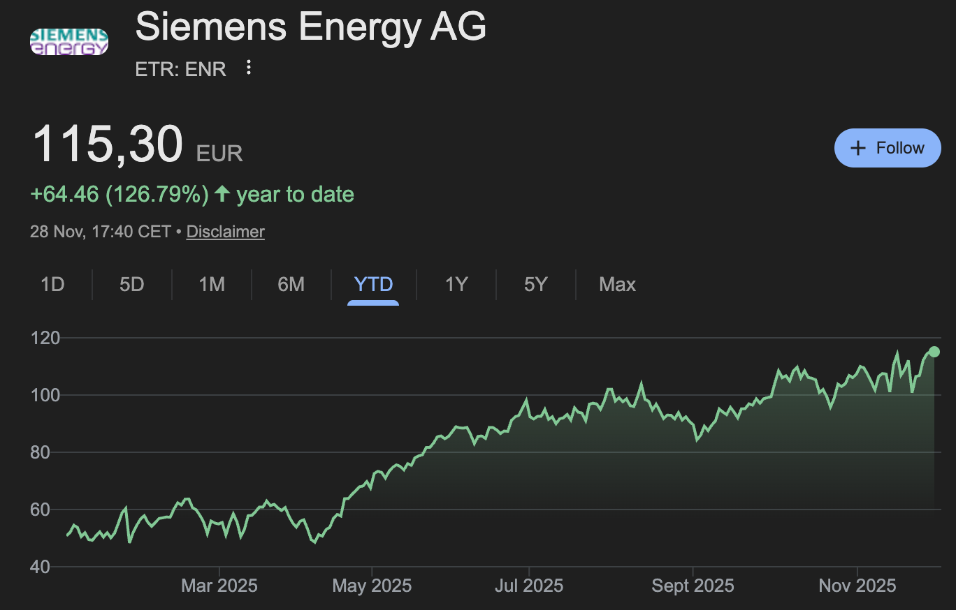 Siemens Energy ha registrato una forte performance azionaria dall’inizio dell’anno, con il titolo in crescita di circa il +127%, superando nettamente sia i competitor industriali europei che il mercato nel suo complesso.