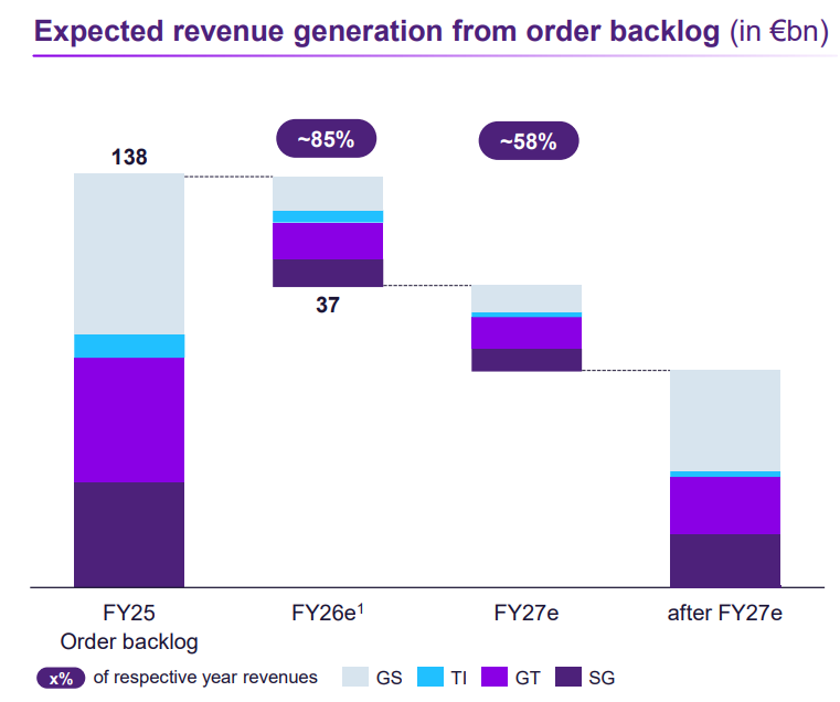 La sostanziale visibilità sul portafoglio ordini (backlog), che copre l’85% dei ricavi FY26 e quasi il 60% dei ricavi FY27, ha ulteriormente sostenuto l’espansione dei multipli, in quanto il modello di business si sta orientando verso ricavi da servizi a margine più elevato e a lunga durata e una raccolta ordini più selettiva.