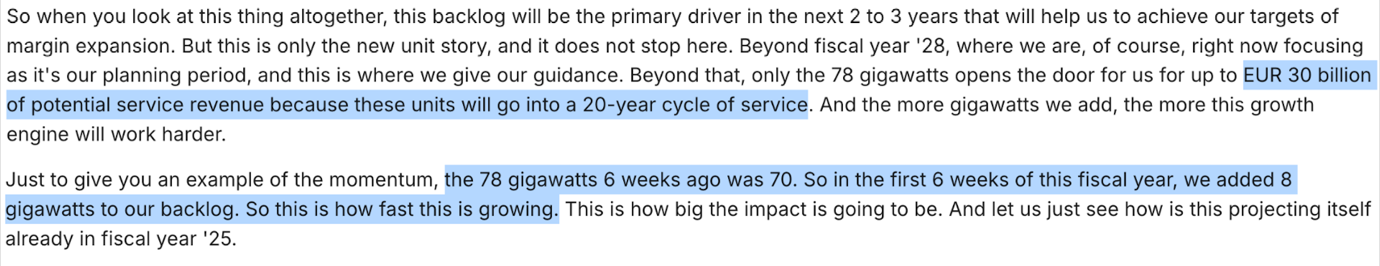 Per ogni turbina a gas installata, Siemens Energy sblocca ricavi da servizi ricorrenti a lungo termine grazie al ciclo di assistenza ventennale. Per fornire un quadro generale, al 20 novembre la flotta di turbine a gas installata aveva una capacità di 78 gigawatt, che sbloccherà fino a 30 miliardi di dollari in ricavi da servizi nei prossimi 20 anni. Alla fine di settembre, la capacità installata era di soli 70 gigawatt, il che significa che la capacità installata è aumentata dell’11,4% nelle ultime sei settimane.