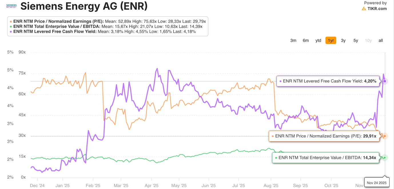 Siemens Energy è scambiata a sconto rispetto ai peer come GE Vernova, che scambia a 55x il multiplo P/E NTM, un divario che può essere in parte spiegato dalla minore redditività attuale di Siemens Energy.